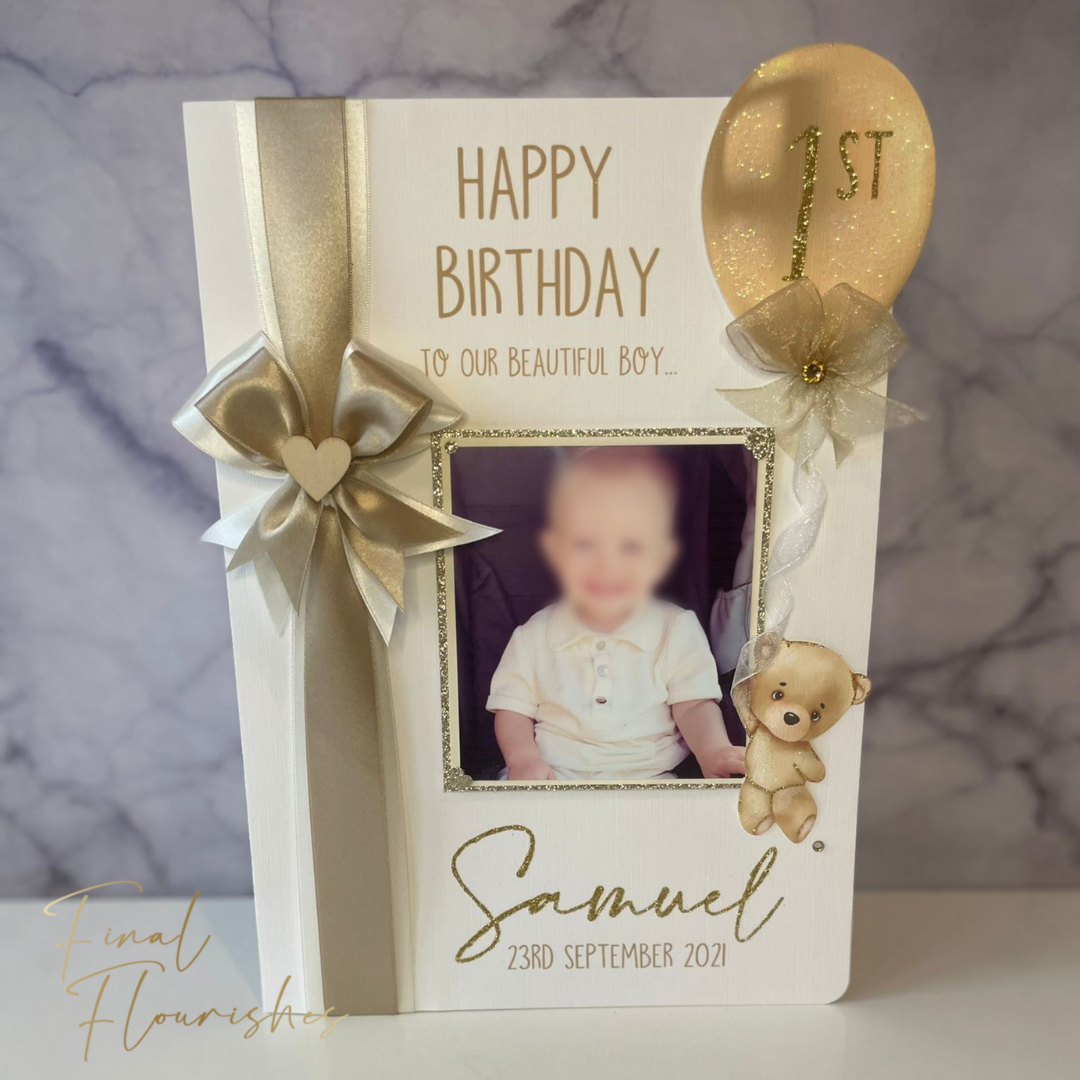 Teddy bear theme is always a favourite for first birthdays! A personalised photo card is the best way to say happy birthday.